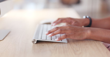 Hands, person and typing on computer in office for administration, research and email feedback. Woman, keyboard and online for communication, schedule update and business report with proposal notes