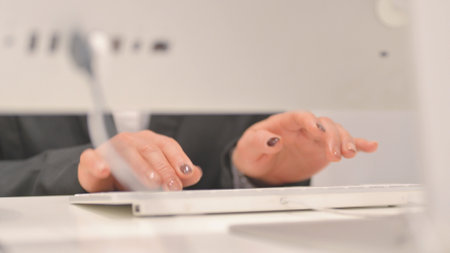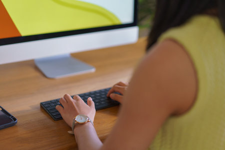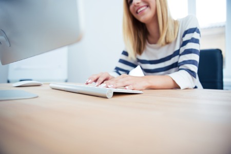 Woman's hands using a wireless computer keyboard and mouse, in front of the computer screen at her desk. Business woman, selective focus, concepts