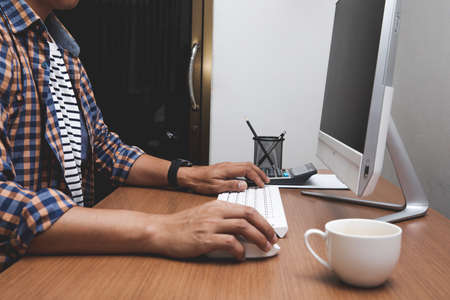 Business, Time, Technology, Work from home, Shelter in place Concept. Businessman typing and using desktop computer in his house.