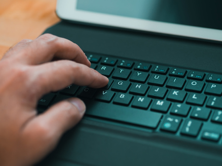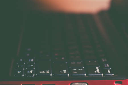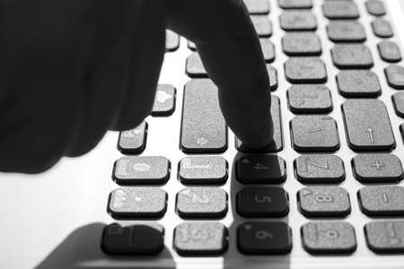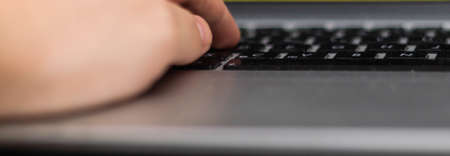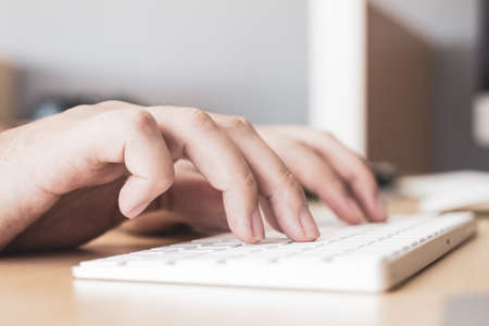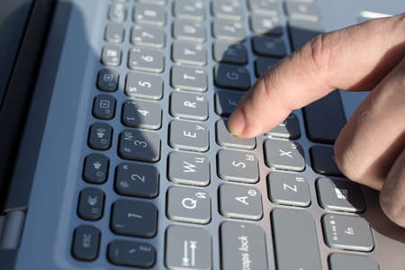 Close-up soft-focus finger typing on keyboard. Man hand using laptop computer in office. Programming and online marketing business concept.