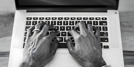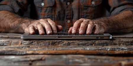 Fingers skillfully navigate keyboard on laptop resting on rustic tabletop. Concept Typing skill, Keyboard prowess, Rustic workspace, Laptop productivity, Digital technology