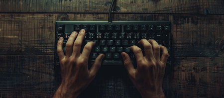 A person typing on a mechanical keyboard. . --ar 16:7 Job ID: 99366994-c802-4c9d-bd9e-18fee27b5f83
