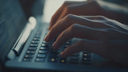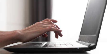 Close up of male hands typing on a laptop keyboard by the panoramic window