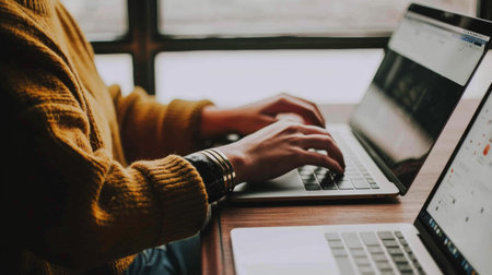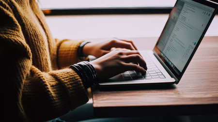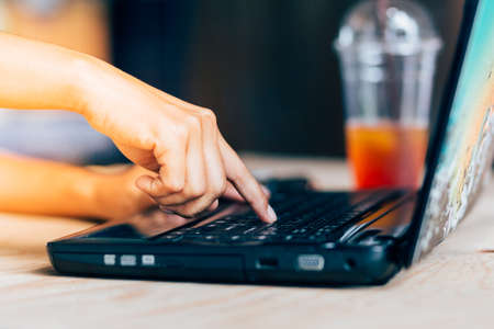 Woman working remotely on her laptop computer managing her work sitting at the table in a cafe. Female hands typing on laptop keyboard