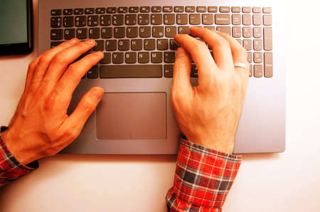 Men's hands in a shirt in a cage lie on the keyboard on a laptop from a first-person view from above. Hands are typing on a laptop. Freelancer, programmer. Typing in the blind. Work at the laptop