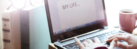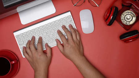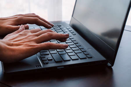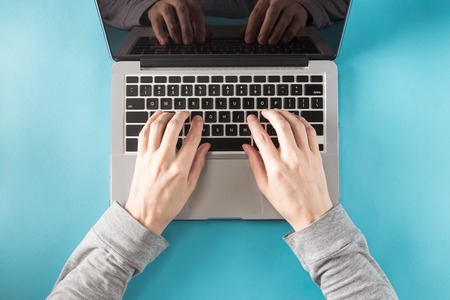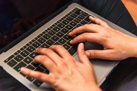 laptop computer technology. blogger or journalist or office worker typing on keyboard. work profession occupation concept