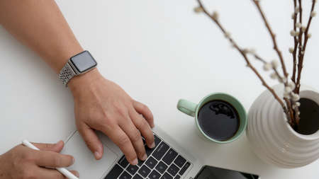 Overhead shot of male typing on laptop with stylus, coffee cup and decoration on white desk
