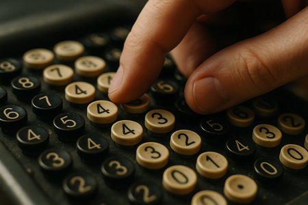 A close-up shot captures a person's finger pressing a '4' button on an old-fashioned, mechanical adding machine. The detailed image highlights the worn, round number keys, some black with white digits, others light-colored with black digits, emphasizing the intricate mechanics and nostalgic appeal of retro computing and traditional calculation methods.
