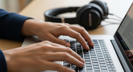 The image depicts a person sitting at a desk, working on a laptop. The individual is wearing headphones and appears to be focused on the laptop screen. The scene suggests a workspace environment, possibly for study or work.