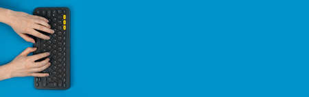 Female hands and keyboard on a blue background. Banner, concept of workspace, work at the home, computer and freelance, design. Flat lay, top view and copy space