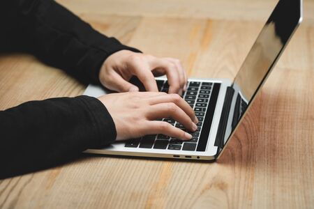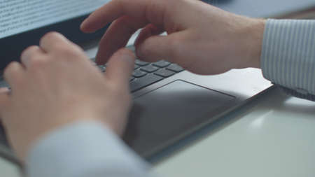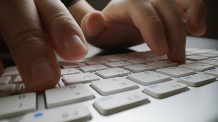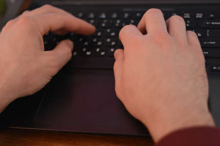 Close up side view of male hands actively typing on the keyboard of laptop. Unrecognizable male hands typing. Technologies concept