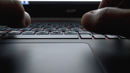 Close up man hand typing keyboard on laptop in darkness operating room, cyber security concept. Hacker using laptop.