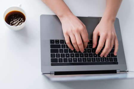 Close-up view of young female freelancer typing on laptop computer while sitting next to the windows with a cup of hot cocoa