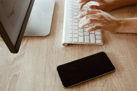 Writer typing modern computer keyboard writing novel in the evening house muffled light. Distance or freelance work or home office on worldwide quarantine time concept image