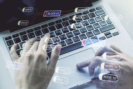 Abstract creative coding illustration with hands typing on laptop on background, software development concept. Multiexposure