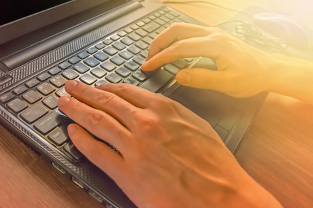 Man hands typing on laptop computer keyboard. Film effect, flare sun