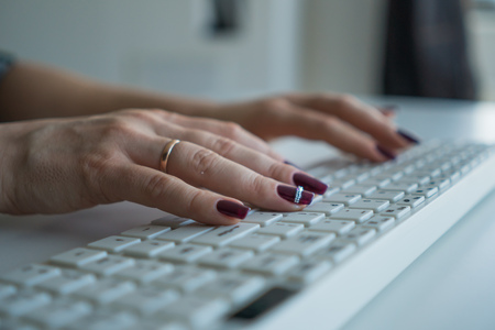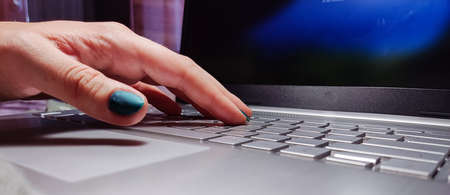 Communication, workplace, business, education, freelance, internet, leisure time and technology concept. Close up side view - woman hands with manicure typing on laptop computer keyboard