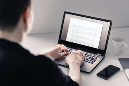 Man writing with laptop. Job applicant making his resume, cv or application. Freelance writer, journalist or teacher working in home office. Workspace with computer and phone. Blogger typing blog.