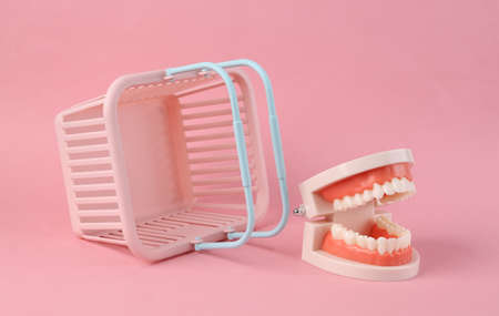 Human jaw model with shopping basket on pink background.