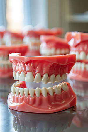 A model of human teeth in a dental office, used for patient education on oral health and anatomy