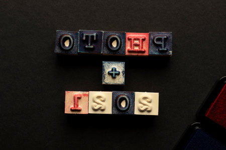 Close-up typewriter stamp on black background, letter words and reverse and straight numbers letters written in red navy blue ink