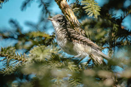 Beautiful portrait of a gray bird among the spruce branches, close-up. Sylvia curruca. Bird watching, wild life