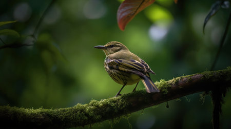 An portrait of a wild bird perched atop a branch, surrounded by a lush green forest. Generative AI