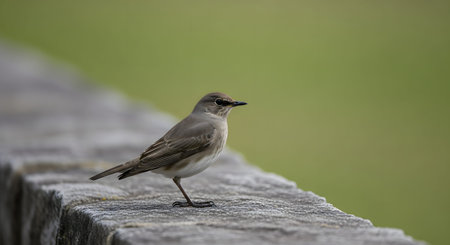 A small brown bird, possibly a flycatcher or chat, perched on a grey stone wall. The bird stands in profile with a sharp focus against a smooth, blurred green background, highlighting its delicate features.