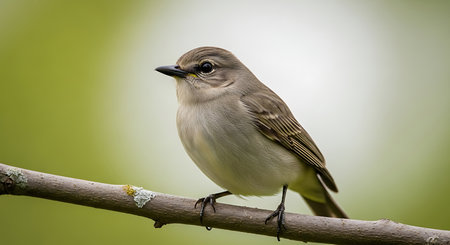 Spotted flycatcher or Muscicapa striata small passerine bird sitting on the branch, close-up portrait, green background.