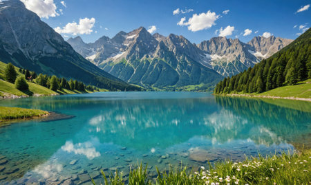 A serene lake reflecting the blue sky and snow-capped mountains in the Swiss Alps on a sunny summer day