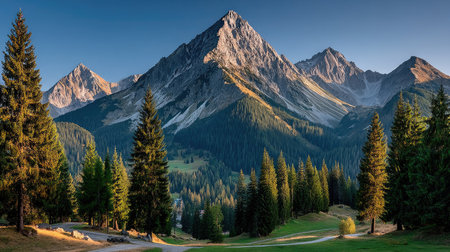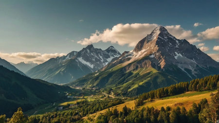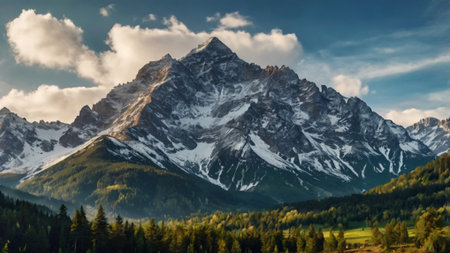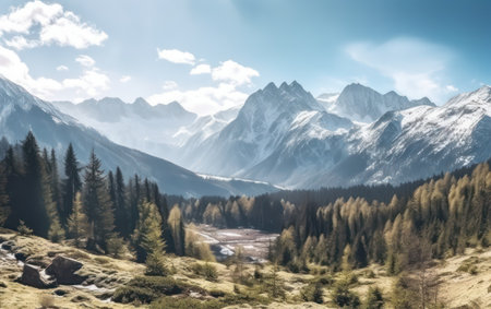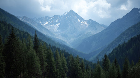 Beautiful mountain landscape with snow-capped peaks and coniferous forest
