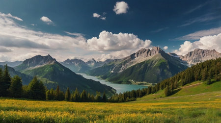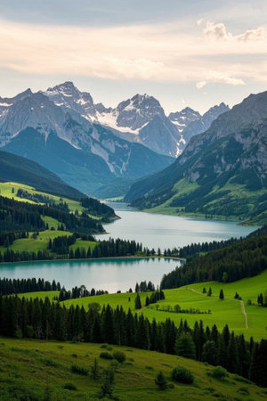 Beautiful alpine landscape with lake and mountains in the background.