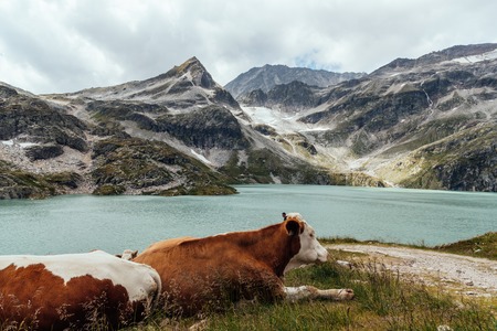 Cow grazing in the mountains in Austrian Alps