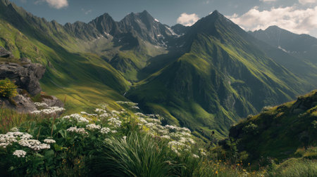 A breathtaking view of a serene mountain landscape showcasing lush green valleys and bright white wildflowers, inviting exploration and appreciation of nature's beauty.