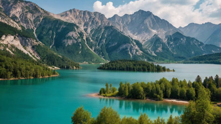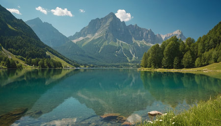 Panoramic view of idyllic alpine lake in summer