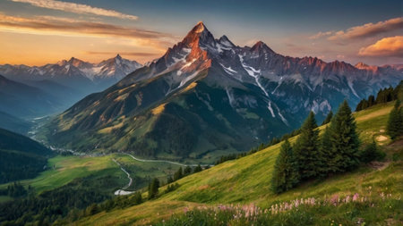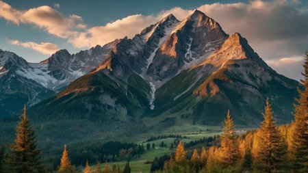 Sunset in the mountains with coniferous forest and snow-capped peaks