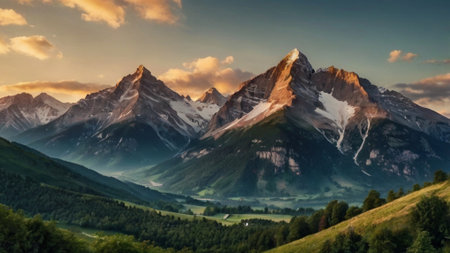 Panoramic view of the mountains in the Swiss Alps at sunset