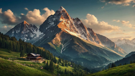 Beautiful alpine landscape with snow-capped peaks in the background