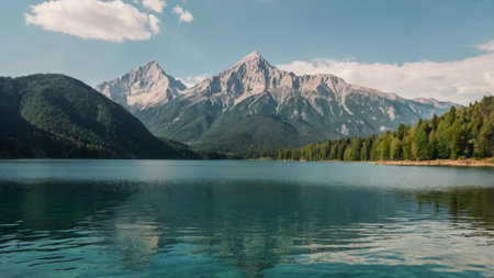 Beautiful alpine lake with crystal clear water and high mountains in background