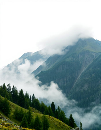 Explore the breathtaking scenery of a majestic mountain range, enveloped by lush forests and dramatic clouds in a tranquil natural setting perfect for outdoor adventures.