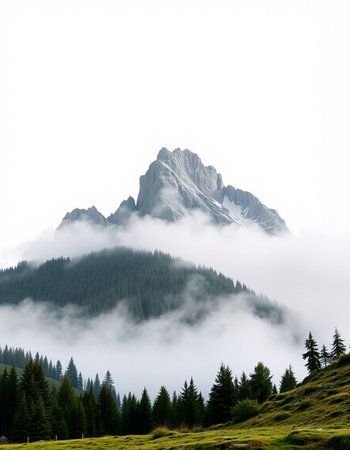 A serene mountain landscape showcasing majestic peaks shrouded in mist and fog, with pine trees in the foreground, evoking tranquility and natural beauty.