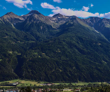 Panorama of the mountain village in the valley of the Alps.