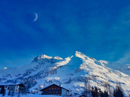 Moon in the snow-capped mountains of Warth by day