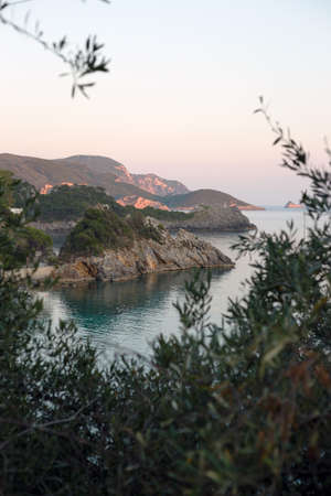 view of the cliffs of the Paleokastritsa bay in the sunset light