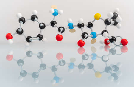 Picture of an isolated molecular model of amoxicillin with its reflection on a table