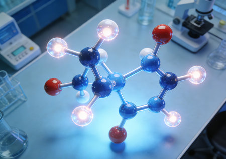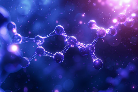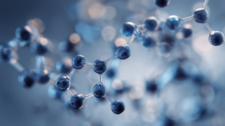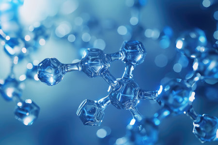 This image showcases a molecular structure composed of interconnected spheres and rods, set against a dark backdrop. The structure is rendered with a glossy appearance, highlighting the connection points. A bokeh effect in the background adds depth. Suitable for scientific publications, educational materials, or use in technology-related projects.