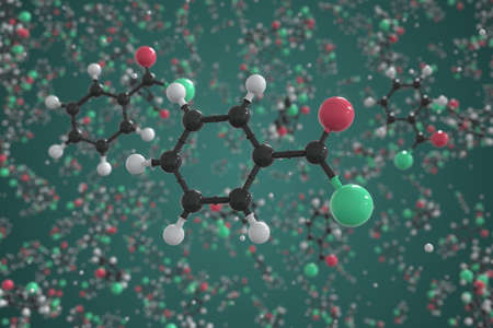Molecule of benzoyl chloride, ball-and-stick molecular model. Science related 3d rendering