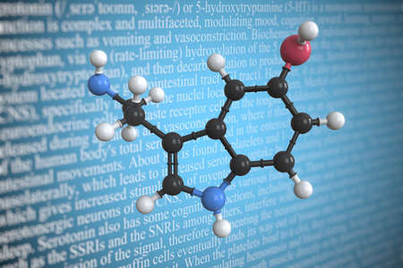Serotonin molecule, monoamine neurotransmitter, primarily found in the gastrointestinal tract, the central nervous system and blood platelets, 3D illustration. Serotonin is thought to affect mood and it is called happiness hormone