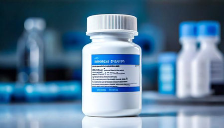 A hand in a gray medical glove holds a bottle of white powder, light blue background, space for text, top view.