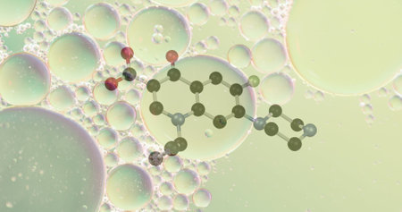 Image of chemical model over bubbles on green background. Science, medicine and digital interface concept digitally generated image.